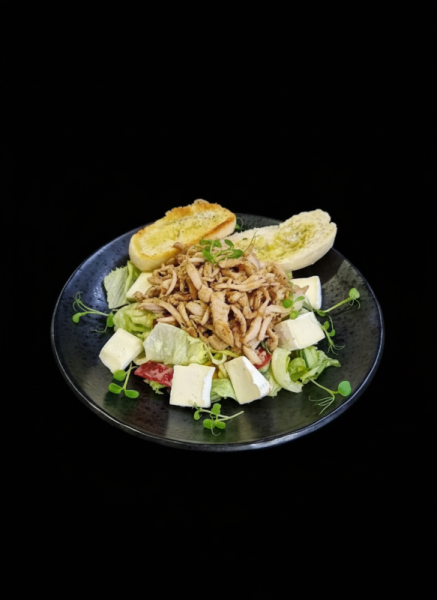 křupavou slaninou, caesar dressingem, parmezanovými hoblinami a bagetkou s bylinkovým máslem