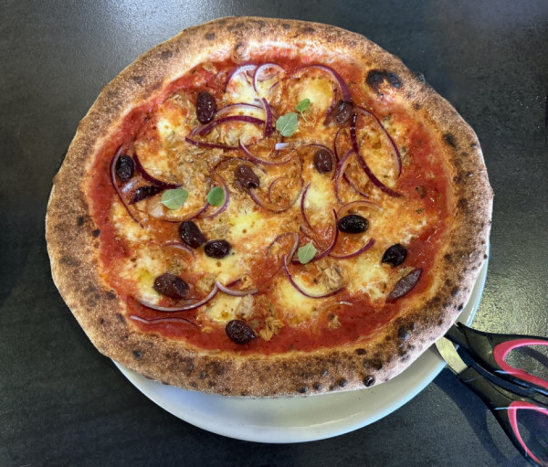 drcená rajčata San Marzo, mozzarella fior di latte, tuňák , červená cibule, olivy, olivový olej