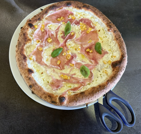 smetana, mozzarella fior di latte, šunka od kosti, kukuřice, olivový olej